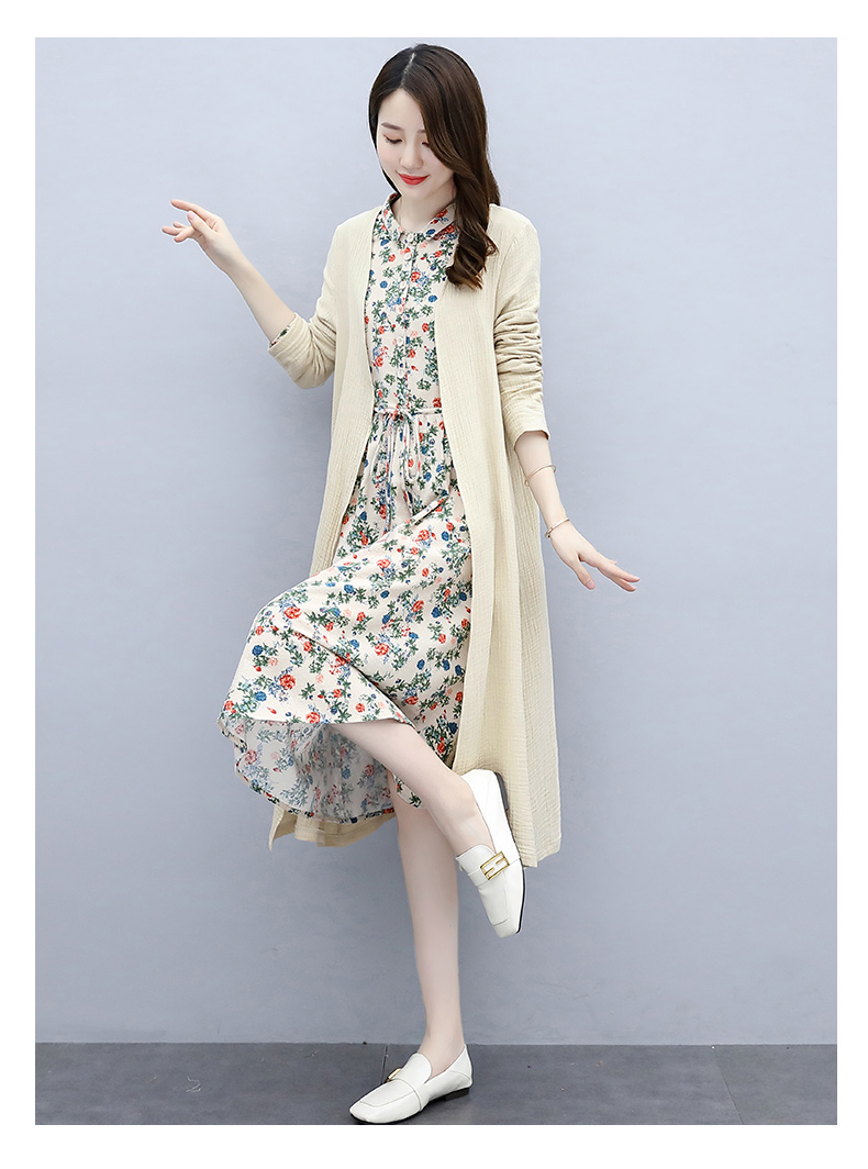 欧迪恵綿麻waピンピス女性秋冬中長款2021年秋の女装新商品長袖小花スカートが窮屈な雰囲気を見せています。ニットカーディガントート女性洋風の2点セットのセクトスカートが紺色XLを隠しています。
